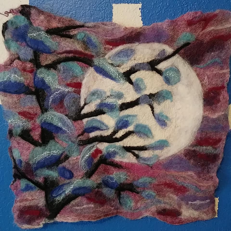 Against a dusky pink and purple sky, a full moon casts a soft, silvery glow. The moon's radiance gently illuminates the magnificent blue blossomed tree in the foreground. This wet-felted wall hanging combines the tactile artistry of wet felting with the enchanting beauty of nature and the cosmos, creating a peaceful and evocative piece of decor that brings the serenity of twilight and the allure of a moonlit night into any space.