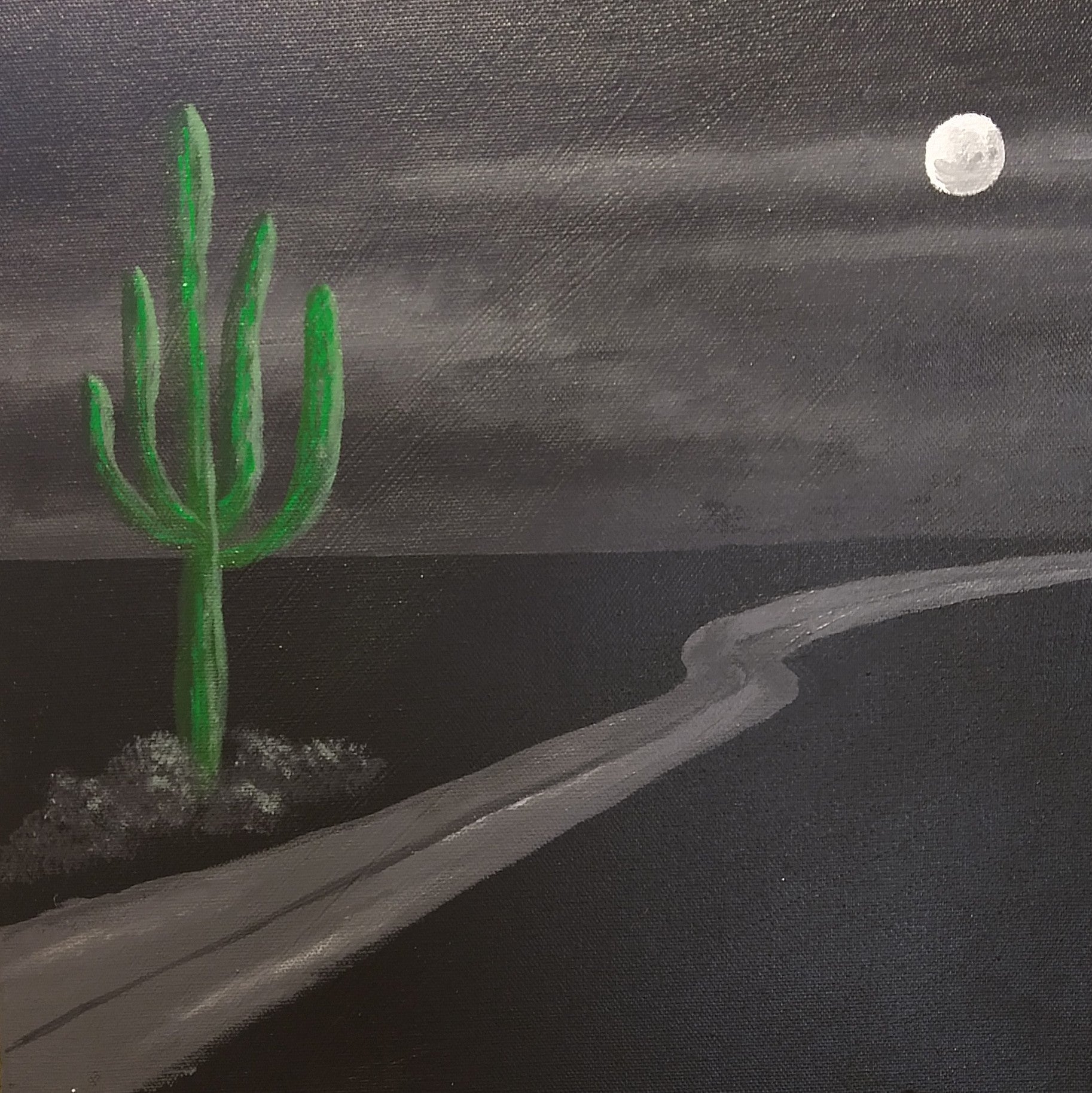 Don't go down that road, you've already been there, done that. Try a different way! 12x12 acrylic on canvas. Done in shades of black with a green undertone, with a pop of sap green shades for the cactus.