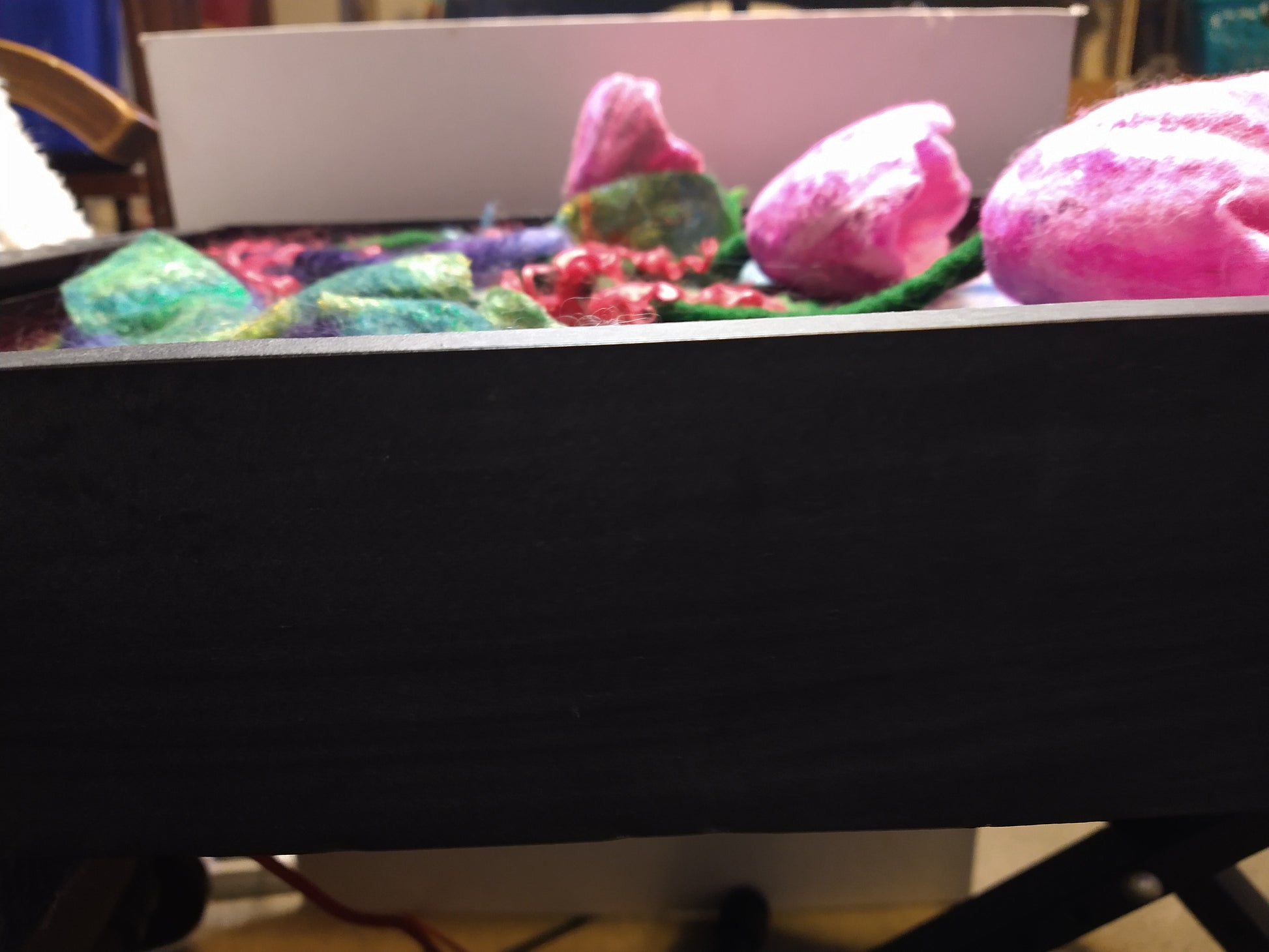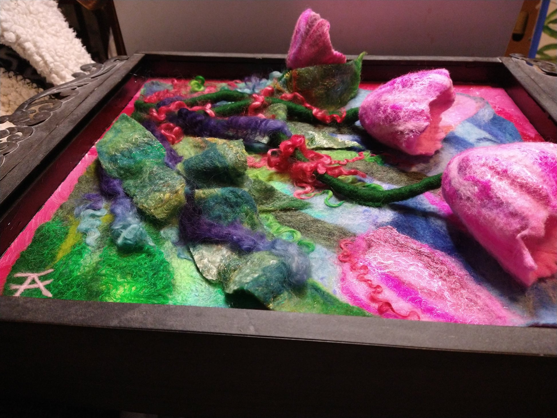 Wet felted background with 3-D wet felted tulips and lock details. 100% wool and silk fibers.